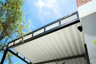 Bạt xếp lớp màu trắng thuộc loại bạt che nắng mưa kéo ngang có thiết kế lượn sóng mang lại thẩm mỹ cao cho khu vực lắp đặt, chúng được cố định trên các khung kim loại cứng cáp, giúp bạn thoải mái tùy biến kéo bung mái che hoặc thu gọn mái che một cách tiện lợi.